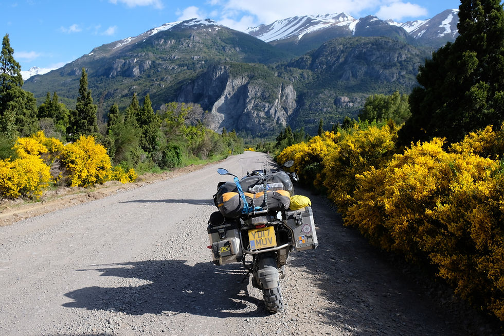 What a difference a day makes yesterday we woke up to gorgeous sunshine and today we woke up to the sound of rain on our roofs. It was coming down in buckets, as we had to load our bikes and make the 140 km move to Villa Angostura. Our tires are now six weeks old have squared off a lot and have very little tread left, and today we were carrying the new ties on the back of our bikes together with all of our usual gear. Which weighed down the back of the bike significantly and